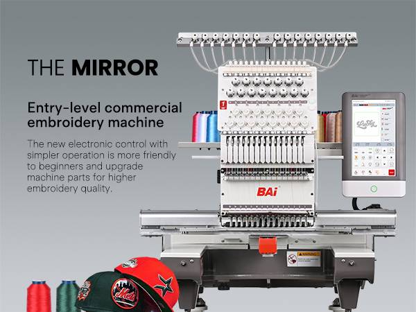 The BAi The Mirror is a 15-needle commercial embroidery machine built for serious production, not hobby use. Designed to handle hats, flats, and a wide range of garments, it delivers consistent stitch quality at speeds up to 1200 stitches per minute, giving operators the ability to move through jobs efficiently without sacrificing precision. Its large embroidery field provides the flexibility to take on everything from small logos to larger, more detailed designs, making it a versatile asset for any shop.