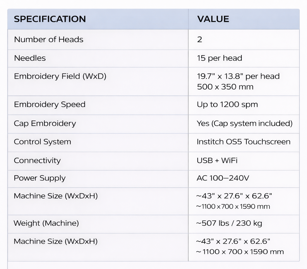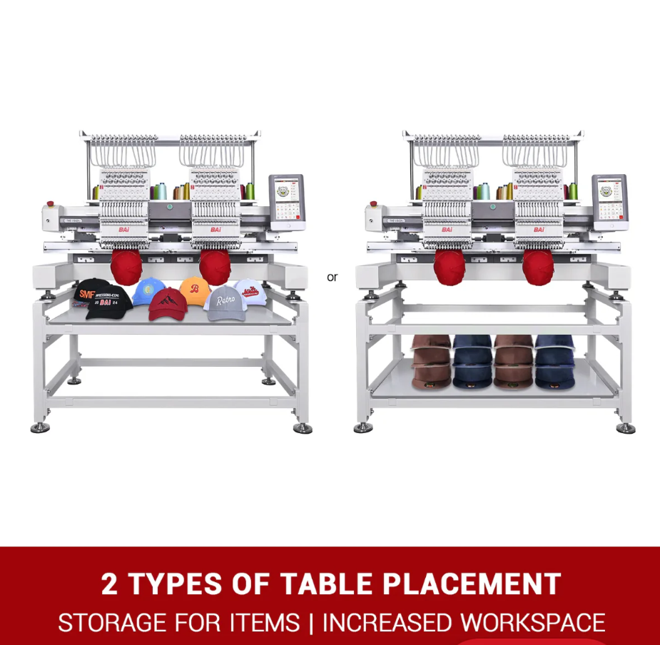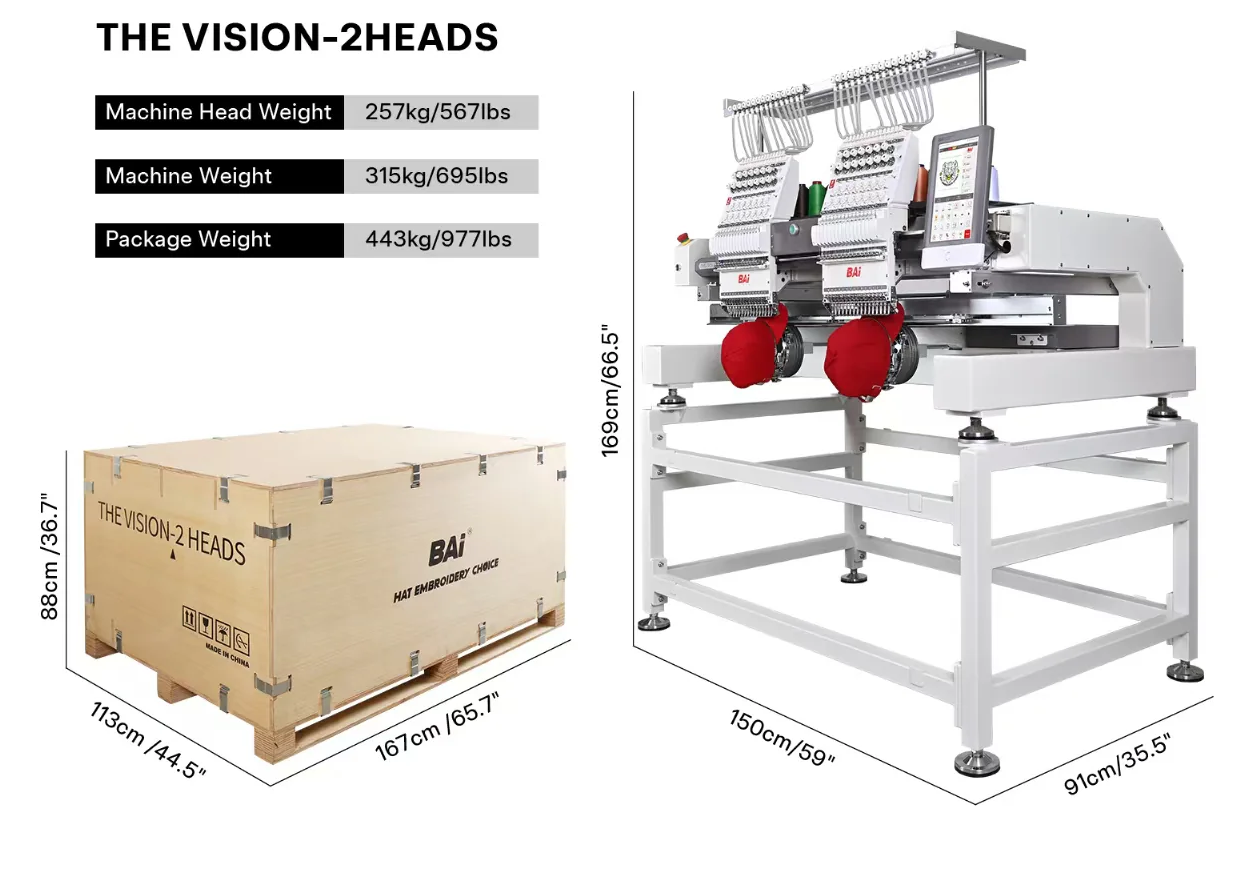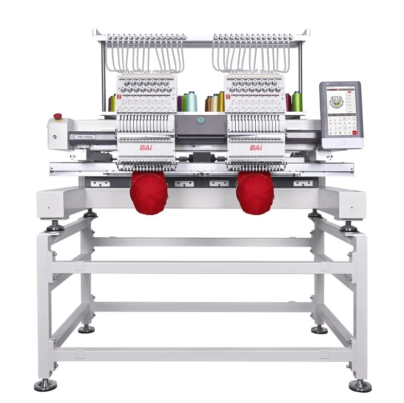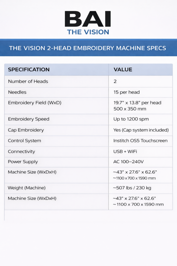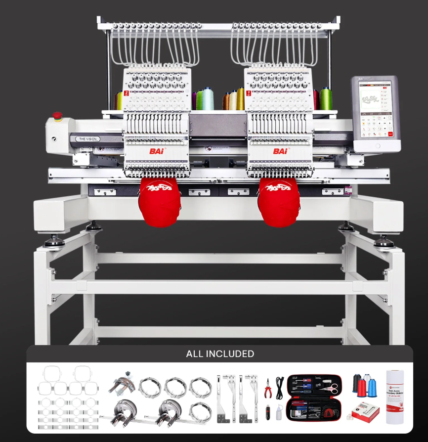 The BAi The Vision 2-Head is a 15-needle commercial embroidery machine built for businesses ready to increase production without doubling labor. Designed to run hats, flats, and a wide range of garments simultaneously, it delivers consistent stitch quality at speeds up to 1200 stitches per minute per head—allowing operators to complete more orders in less time with the same level of precision.
