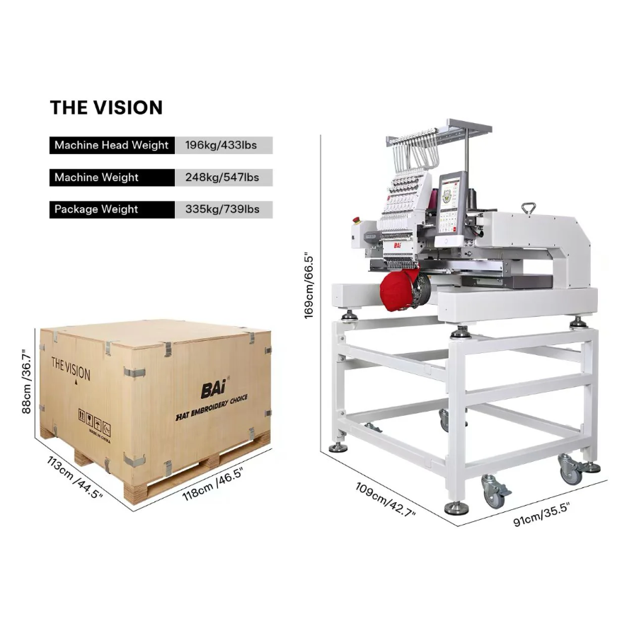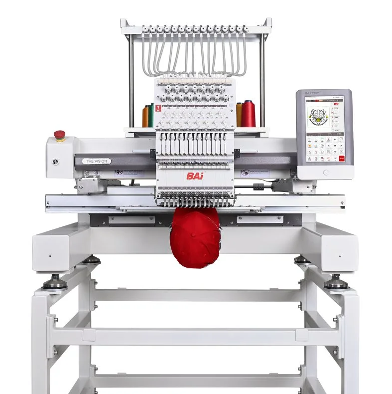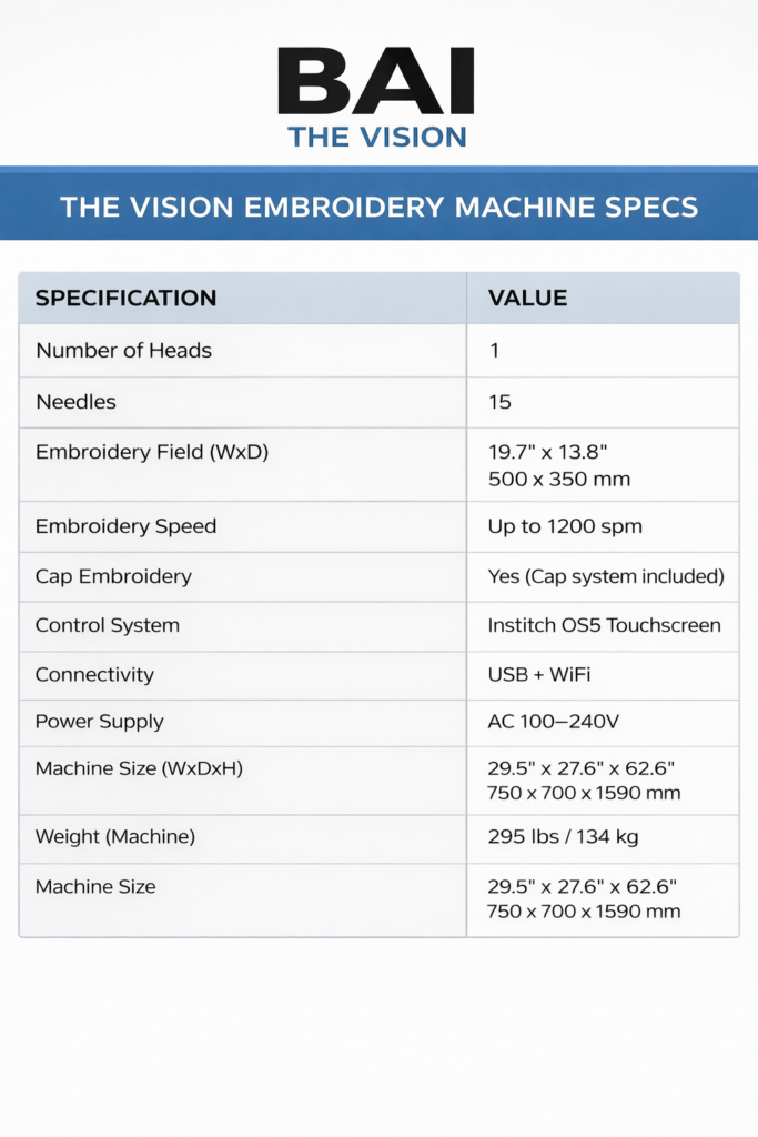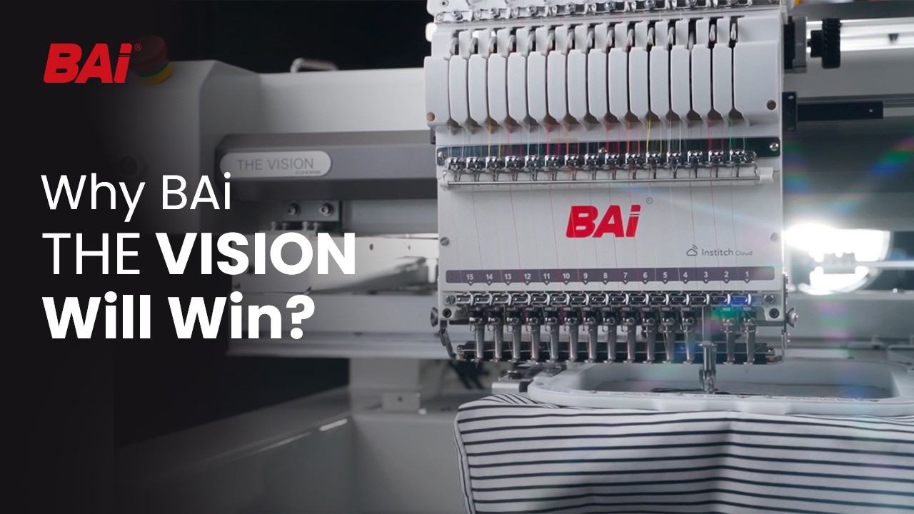 The BAi The Vision is a 15-needle commercial embroidery machine built for businesses that need efficiency, consistency, and room to grow. Designed to handle hats, flats, and a wide range of garments, it delivers clean, precise stitching at speeds up to 1200 stitches per minute—keeping production moving without compromising quality.